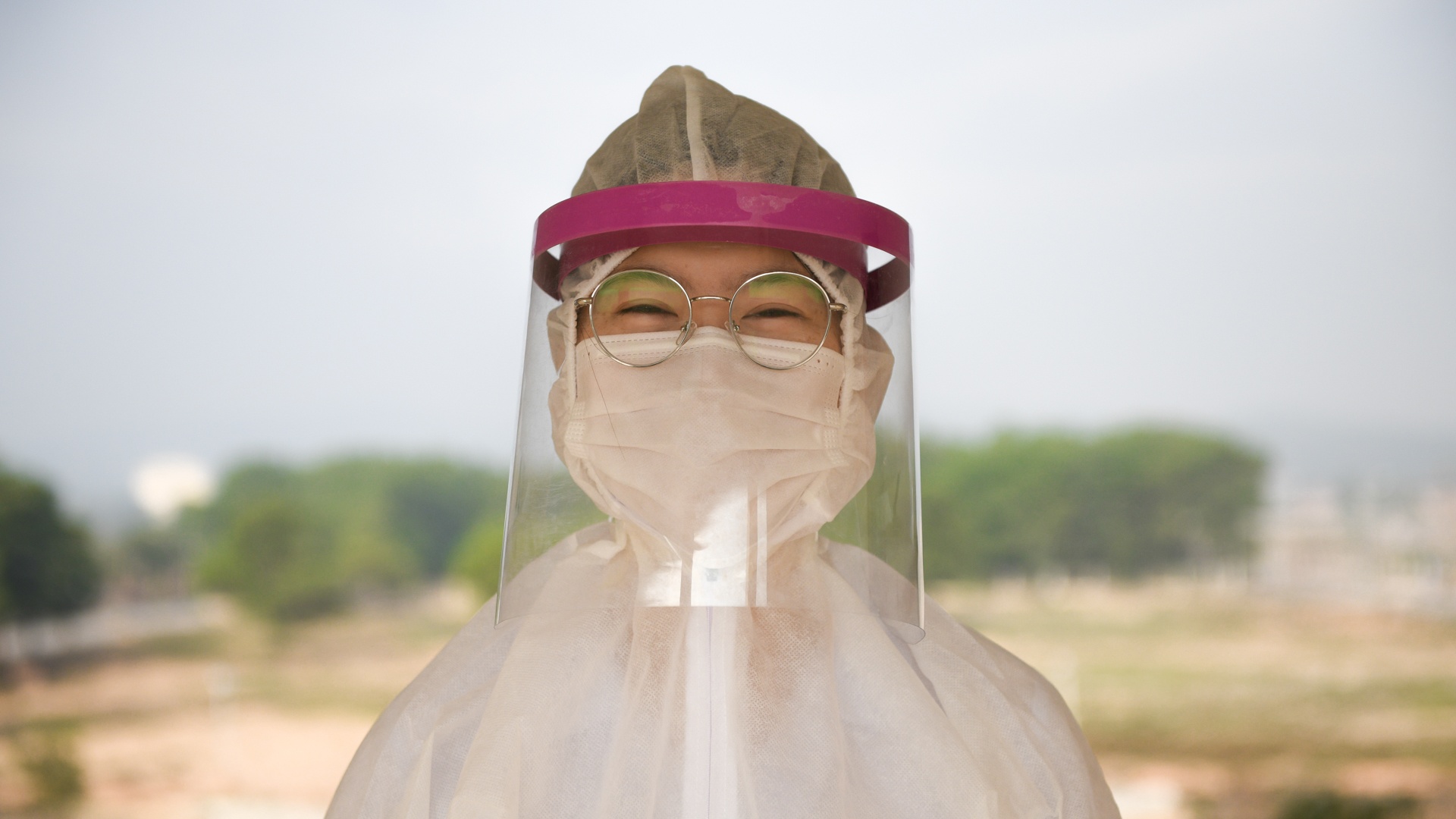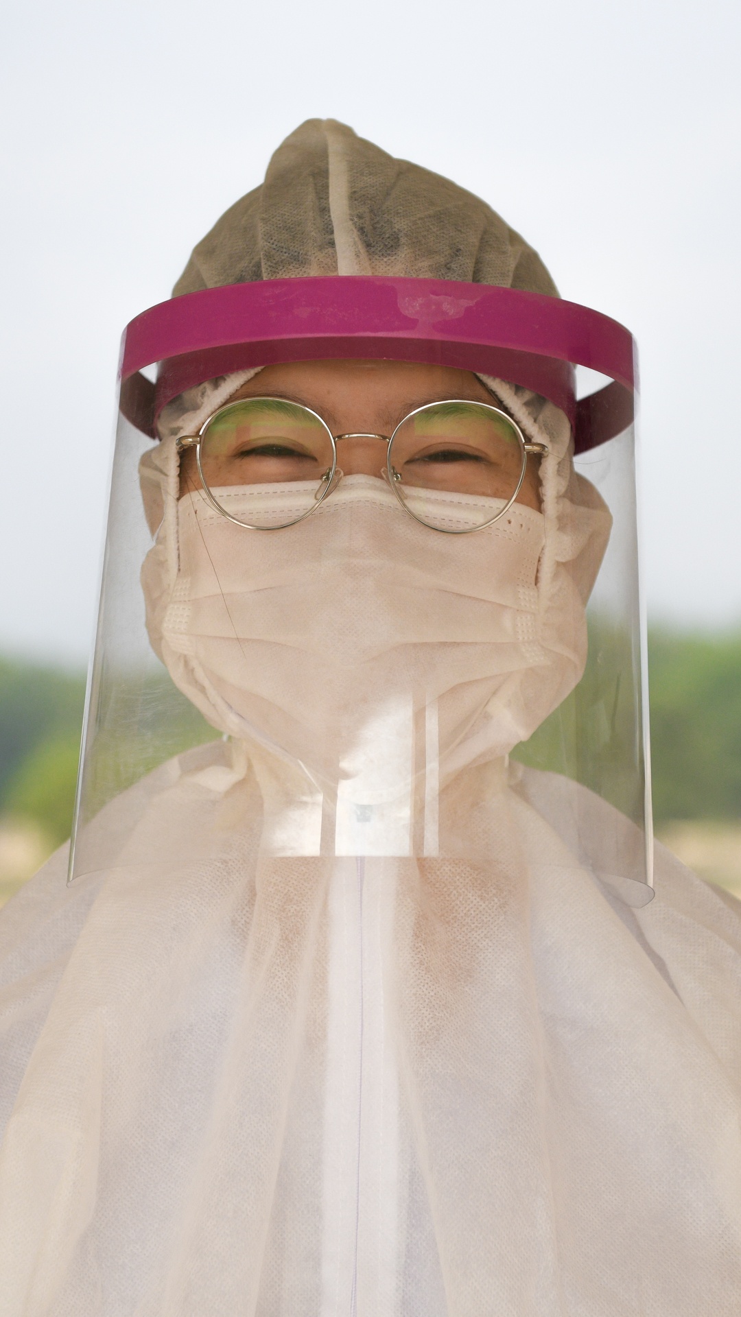 Quê tôi ở Hưng Yên, học đại học xa nhà đã 4 năm nay. Giờ đi chống dịch, tôi cũng không quá lạ lẫm vì bản thân đã tự lập. Buổi sáng hôm nay, chúng tôi sẽ thực hiện kiểm tra thân nhiệt của hơn 600 F1 tại khu. Trước khi bắt đầu công việc, tôi mặc bảo hộ đầy đủ. |