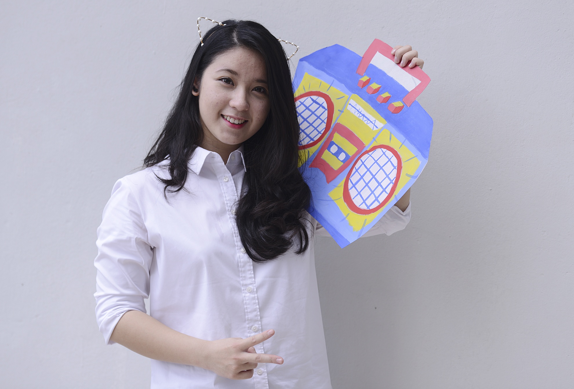 | Kim Chi - đại sứ trường Ams năm 2013 nhí nhảnh với chiếc radio bằng giấy. |