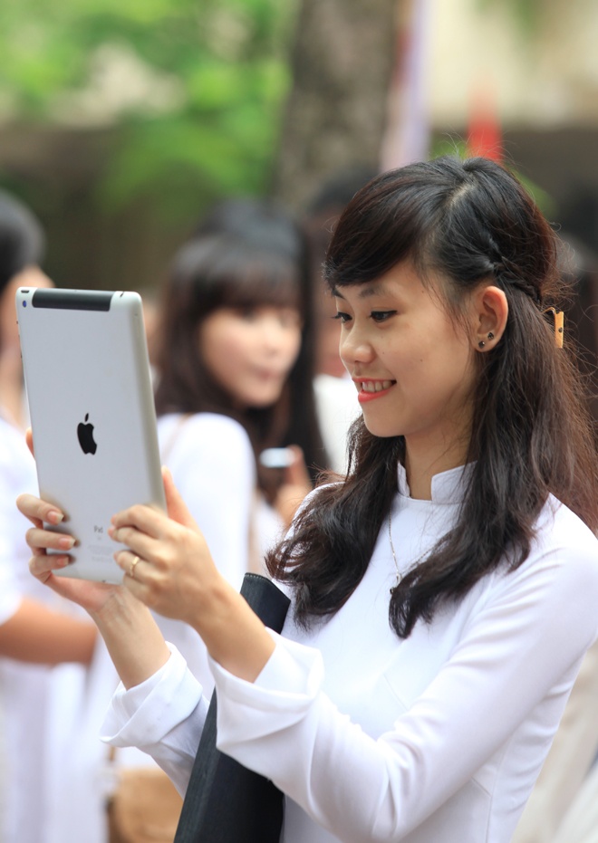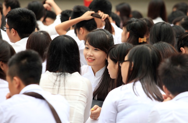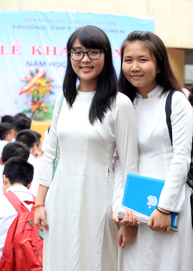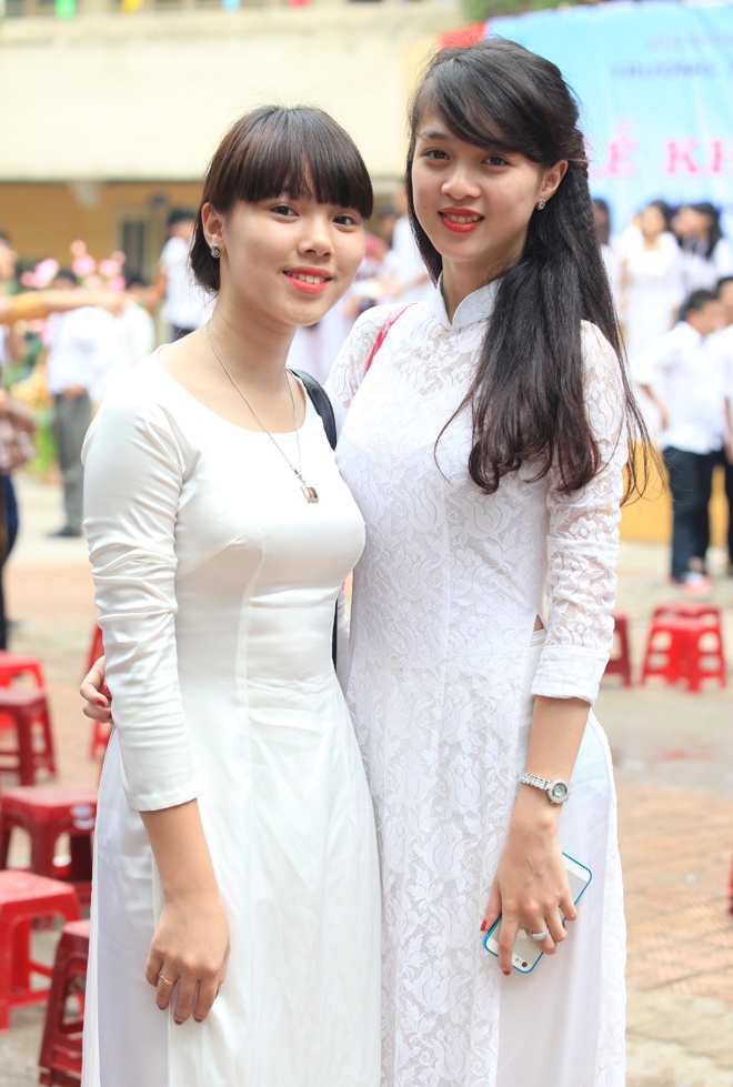| Các nữ sinh lại được mặc áo dài đến trường dự lễ. |