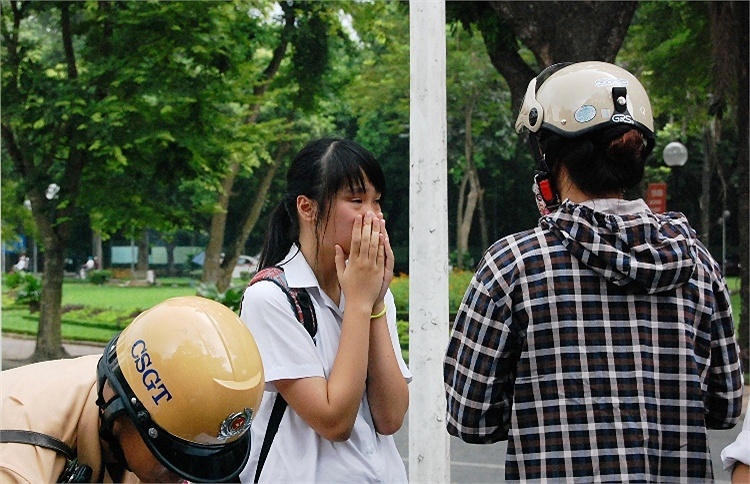 | Một nữ sinh khóc nức nở sau khi bị CSGT giữ xe đạp điện vì không đội mũ bảo hiểm. |
