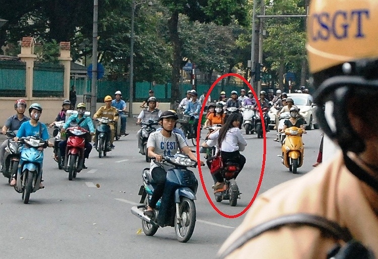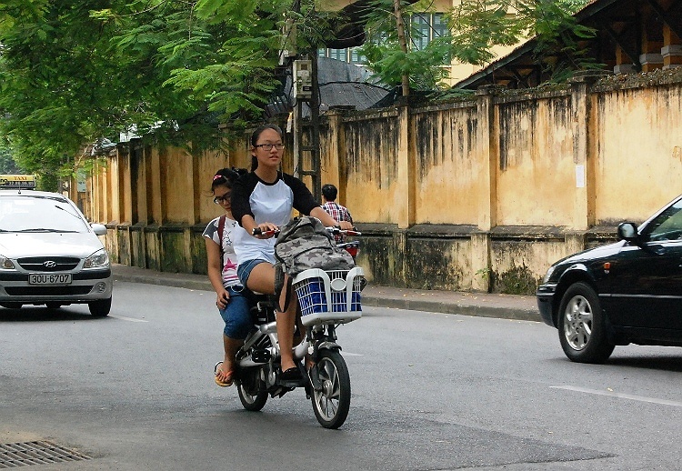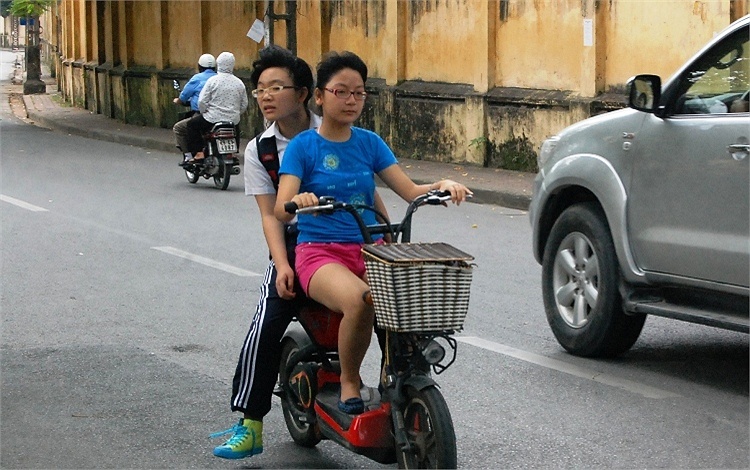 | Hiện tượng nữ sinh đi xe đạp điện không đội mũ diễn ra phổ biến ở Hà Nội. |
