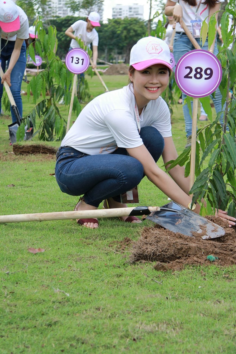 Lịch trình tiếp tục với hoạt động trồng cây bảo vệ môi trường vào sáng 11/11 tại khu vực Cresident Mall, Q.7, TP.HCM. Dù trời nắng khá gay gắt nhưng các cô gái xinh đẹp vẫn xông xáo thực hiện công việc.