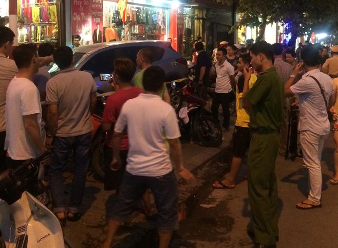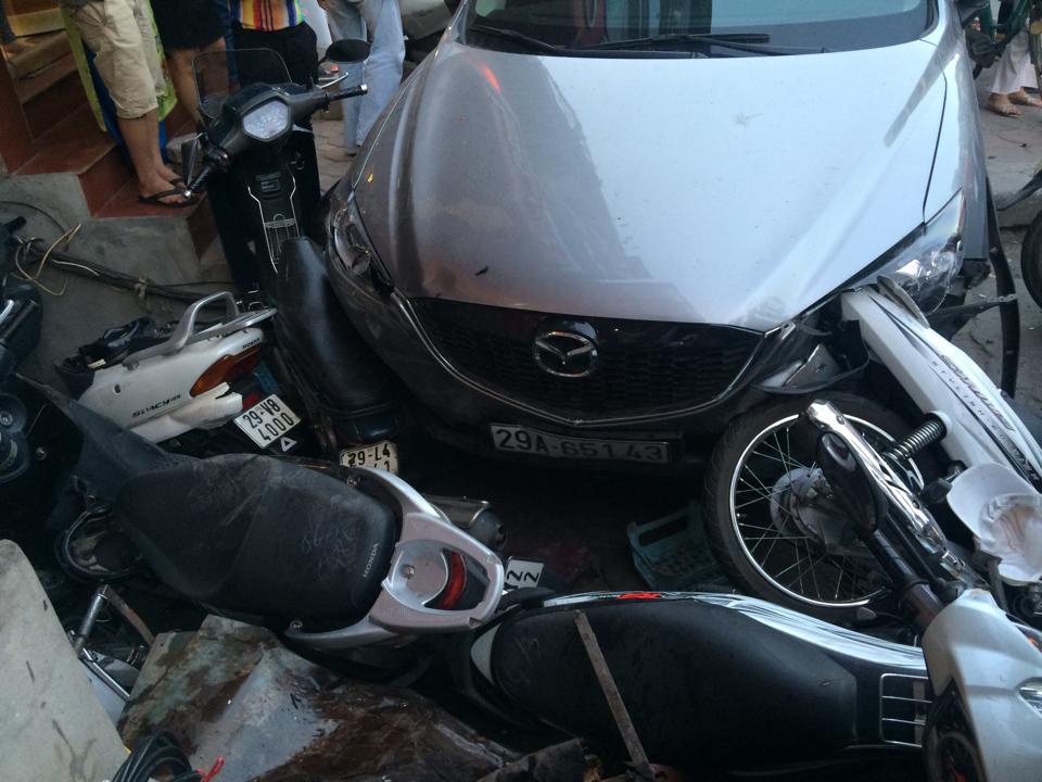 Sau va chạm, chiếc Mazda lao lên vỉa hè phố Kim Mã (Ba Đình, Hà Nội) đâm gục hơn 10 xe máy, xe đạp khiến 7 người bị thương, trong đó một người bị gẫy chân.