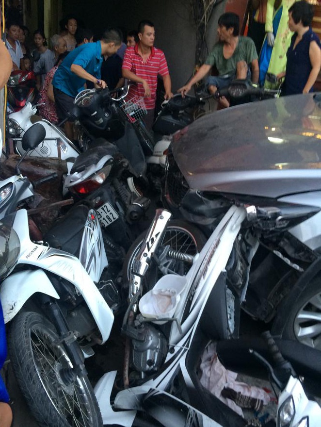 | Xế hộp kéo lê xe máy, tiếp tục lao lên vỉa hè đâm gục nhiều xe ga đắt tiền như SH, Vespa, Lead và hai xe đạp. Gần 10 người chủ yếu là phụ nữ bị đâm trúng. |