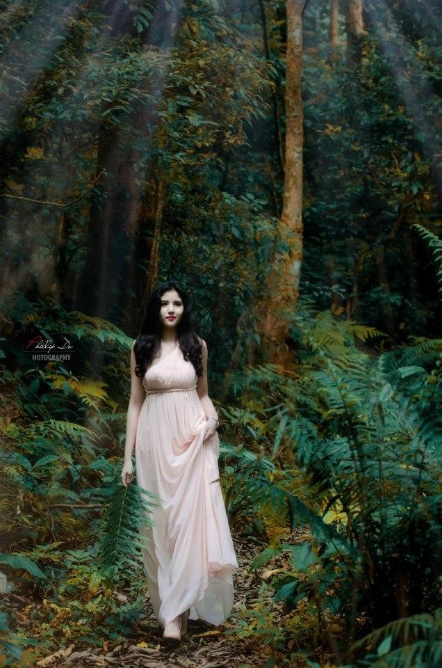 Thoát khỏi trang phục cử nhân, Mai trông cuốn hút trong bộ váy dài với chủ đề "Lạc vào thiên nhiên".