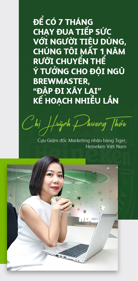 - Tôi mất 6 tháng để suy nghĩ, cân nhắc trước khi quyết định rời ngành chăm sóc sức khỏe. Thời điểm ấy, tôi “thèm” nạp nguồn năng lượng mới, nhanh và sôi động hơn. Khi cảm thấy bản thân phù hợp với đặc thù của ngành bia là kết nối, tận hưởng cuộc sống và phù hợp với giá trị cốt lõi của Heineken Việt Nam, tôi cảm thấy hứng thú và quyết định gia nhập công ty. Lúc đó, công ty đang tìm người đảm trách nhãn hiệu Tiger. “Bài toán” tiếp theo tôi đối mặt là có đủ bản lĩnh để đảm nhận nhãn hàng đầy nam tính này không?