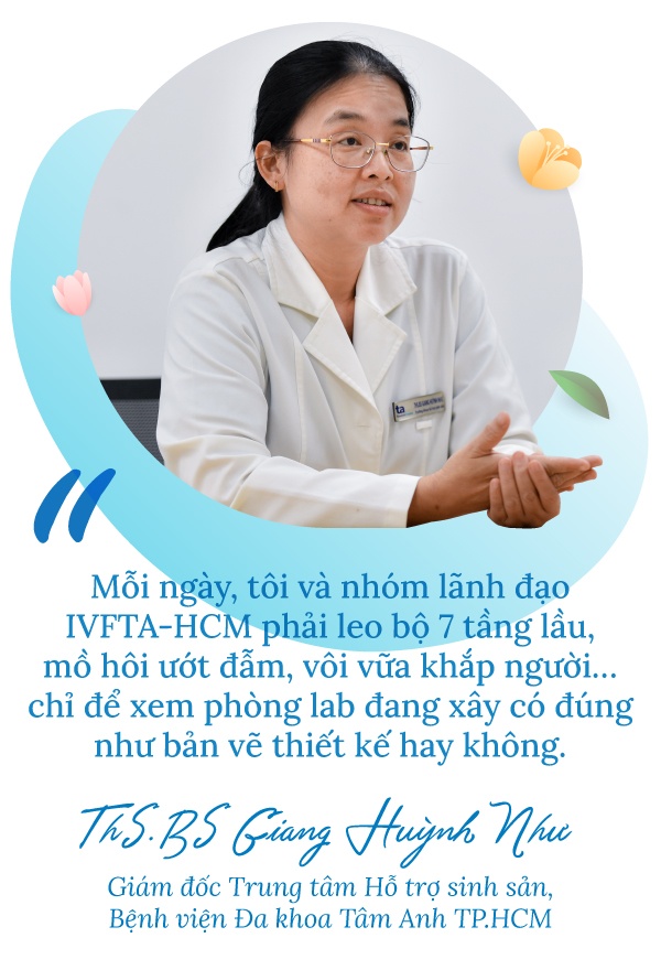 “Khi bệnh viện đang xây, mỗi ngày, tôi và nhóm lãnh đạo IVFTA-HCM phải leo bộ 7 tầng lầu, mồ hôi ướt đẫm, vôi vữa khắp người… chỉ để xem phòng lab có đúng như bản vẽ thiết kế mà tôi đã tham khảo nhiều ý kiến chuyên gia nước ngoài hay không. Chúng tôi chú trọng từng đường đi của ống khí, vị trí cửa đến cách đặt bàn làm việc, để hiện thực hóa phòng lab hiện đại nhất Việt Nam”, bác sĩ cho biết.