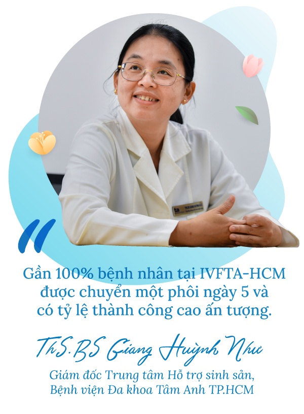 “Chúng tôi tự hào về tỷ lệ thành công sau chuyển phôi đạt 70% với phôi ngày 5, nuôi trong tủ nuôi phôi timelapse, AI và sinh thiết đánh giá di truyền không có bất thường. Thành công được tính trên tỷ lệ em bé sinh ra khỏe mạnh chứ không chỉ là đậu thai. Ngoài ra, chúng tôi tự tin chuyển một phôi duy nhất trong một lần, giảm tối đa nguy cơ đa thai, ngăn ngừa nguy cơ giảm thai, giảm nguy cơ sinh non, bệnh lý truyền máu song thai và nhiều biến chứng thai kỳ nguy hiểm khác. Hiện tại, gần 100% ca bệnh tại Tâm Anh chỉ chuyển một phôi mà vẫn đạt tỷ lệ thành công cao”, bác sĩ Như nói thêm.