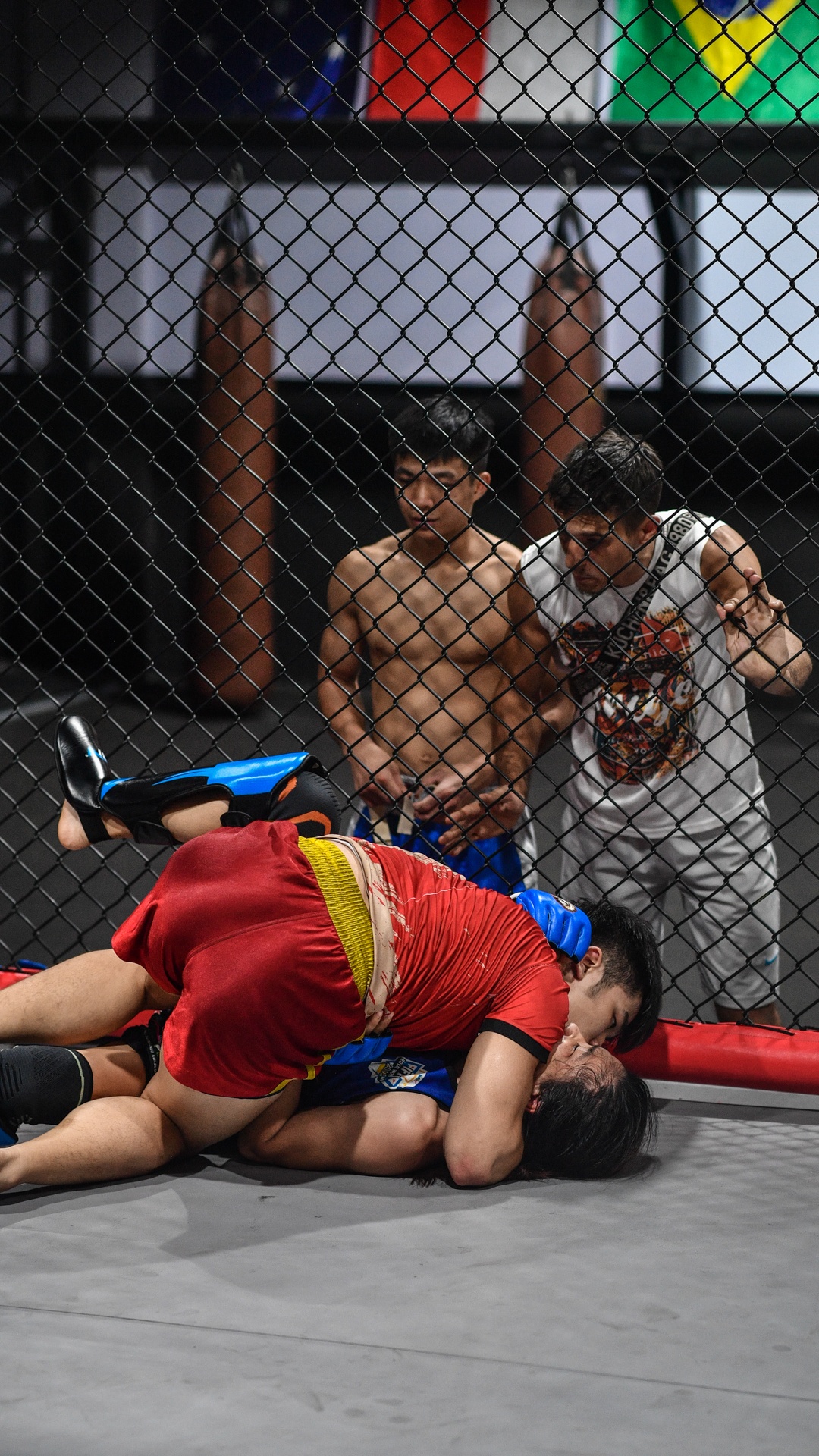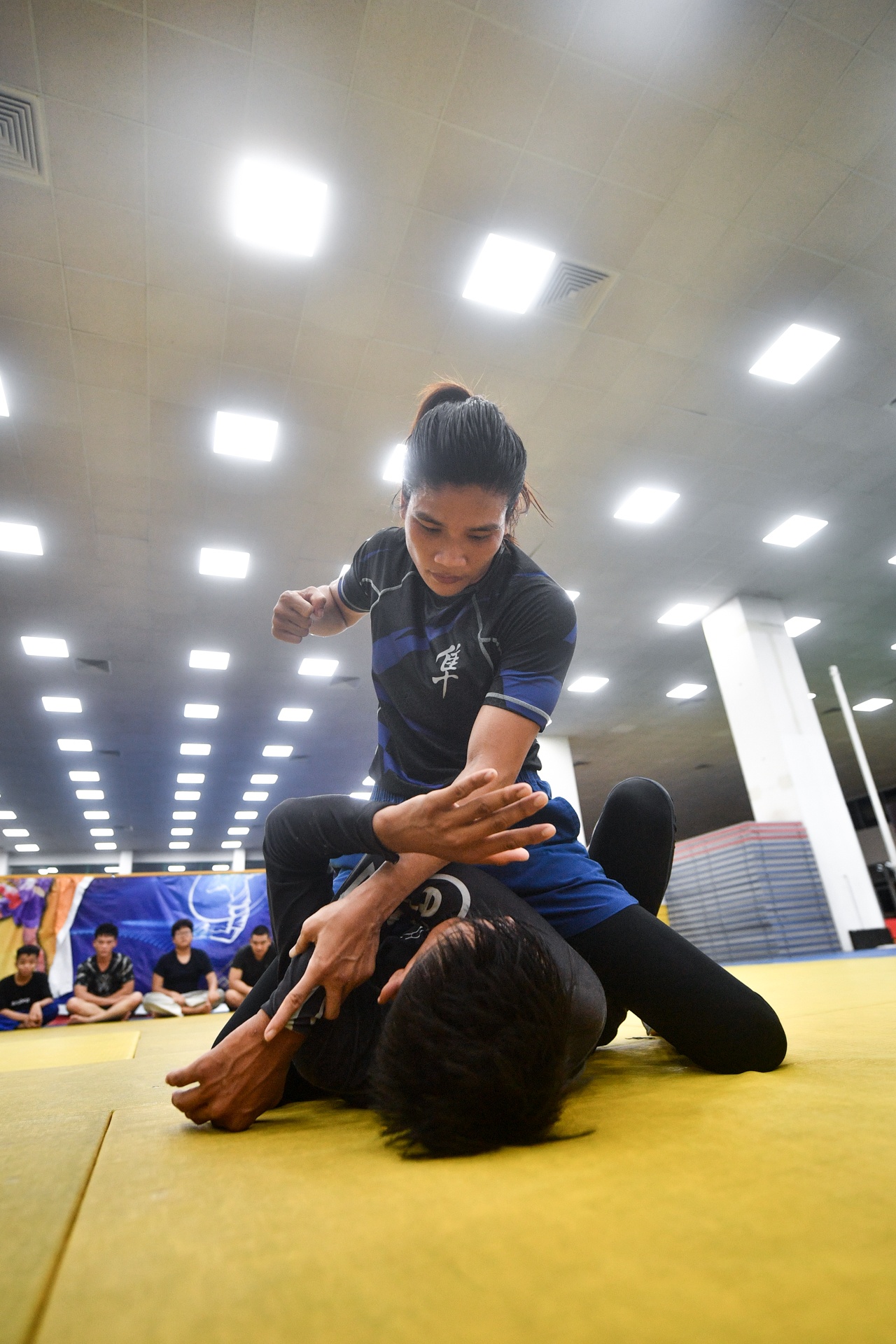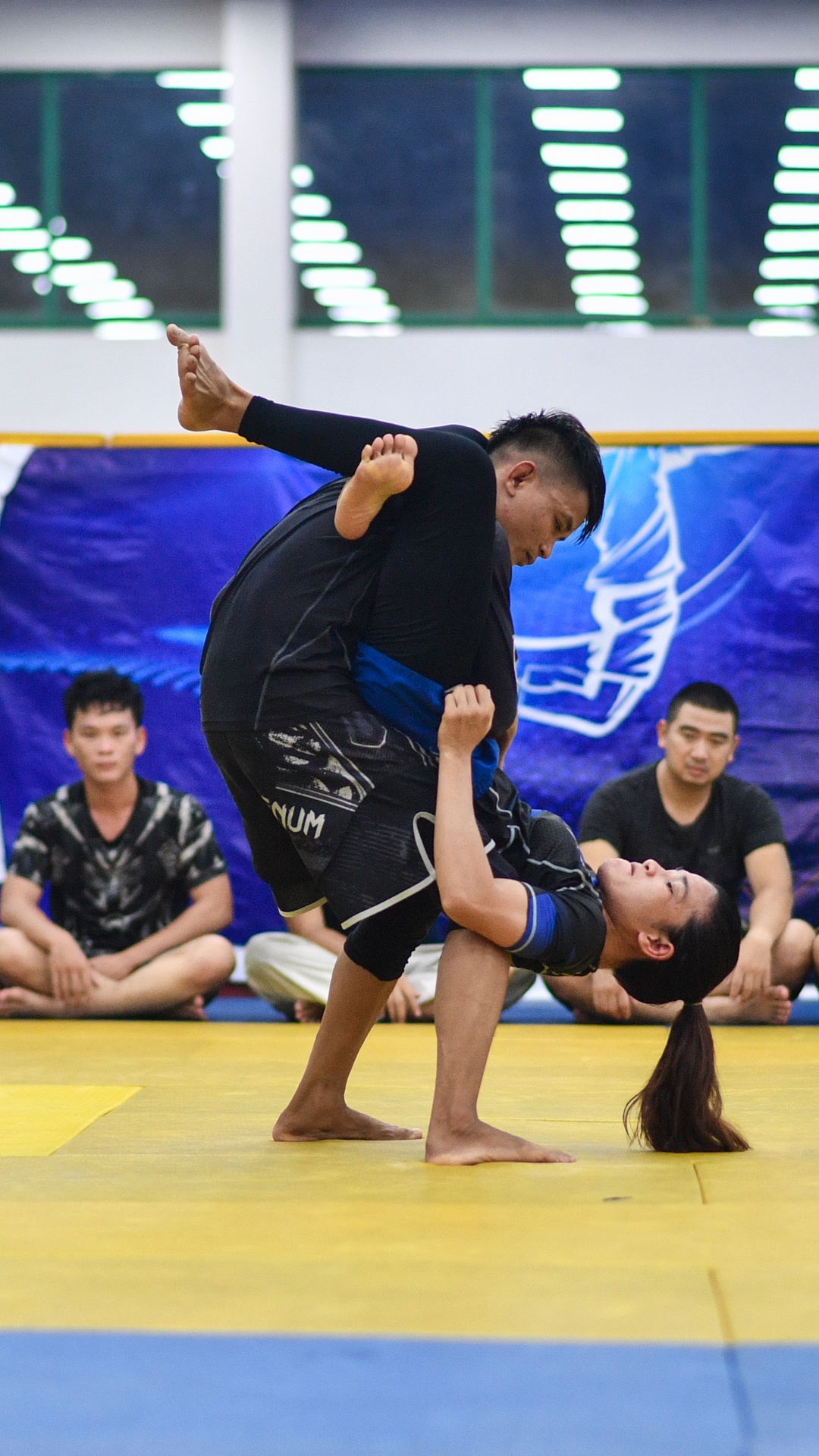 | Tôi tiếp tục trận đối kháng thứ hai. Đối thủ lần này là một nam võ sĩ cùng hạng cân nên tôi dễ dàng kiểm soát thế trận. Tôi có cơ hội dùng đòn vật để quật ngã đối thủ hai lần trong trận đấu. |