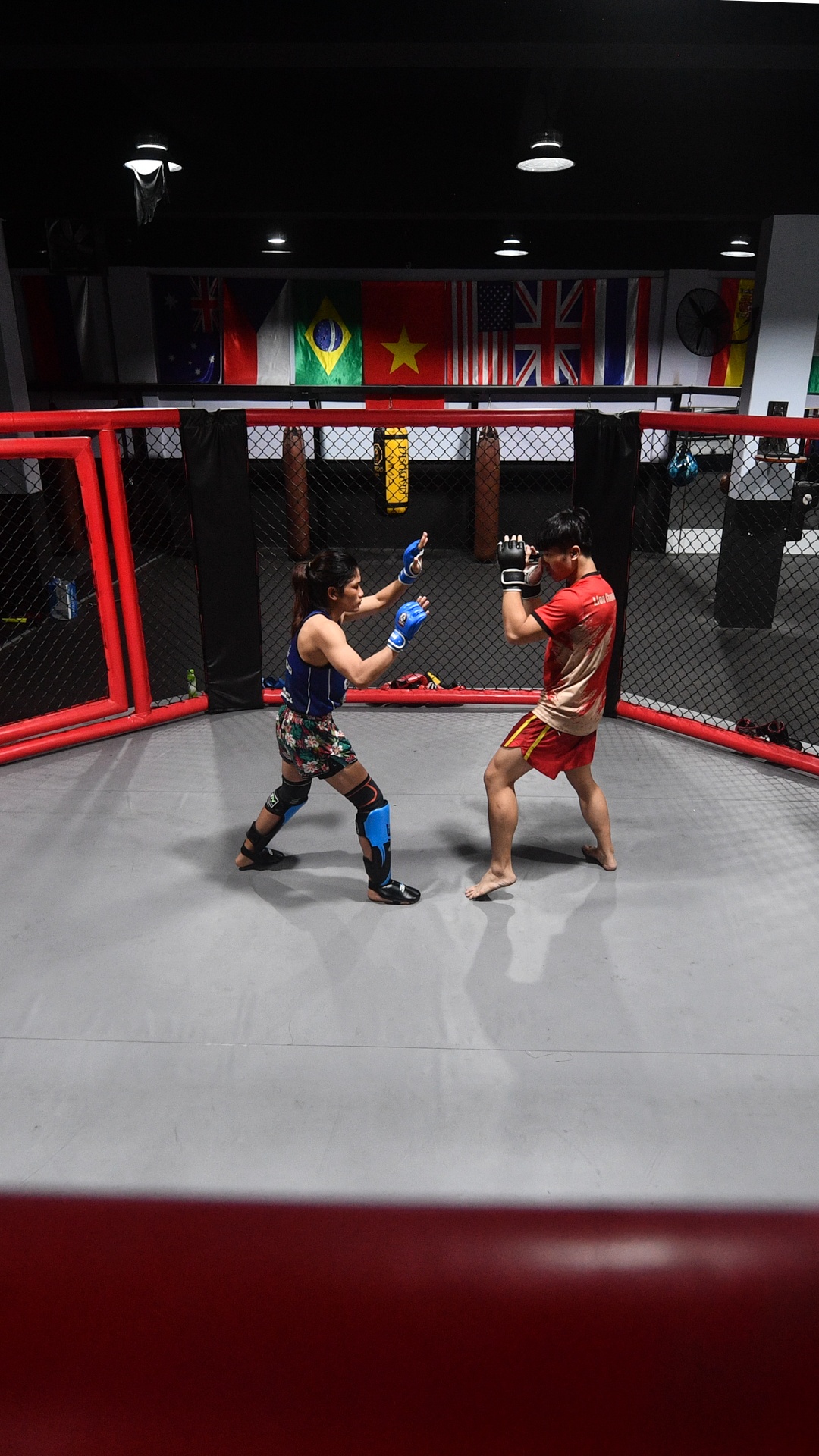 | Sau ca tập boxing buổi sáng, tôi có trận đấu đối kháng trong lồng sắt với một nam võ sĩ. Mỗi tuần, tôi thường dành một buổi tập trong lồng sắt để làm quen với không gian, sàn thi đấu. Trong lồng sắt rất ít luật lệ, chỉ có đánh và bị đánh. |