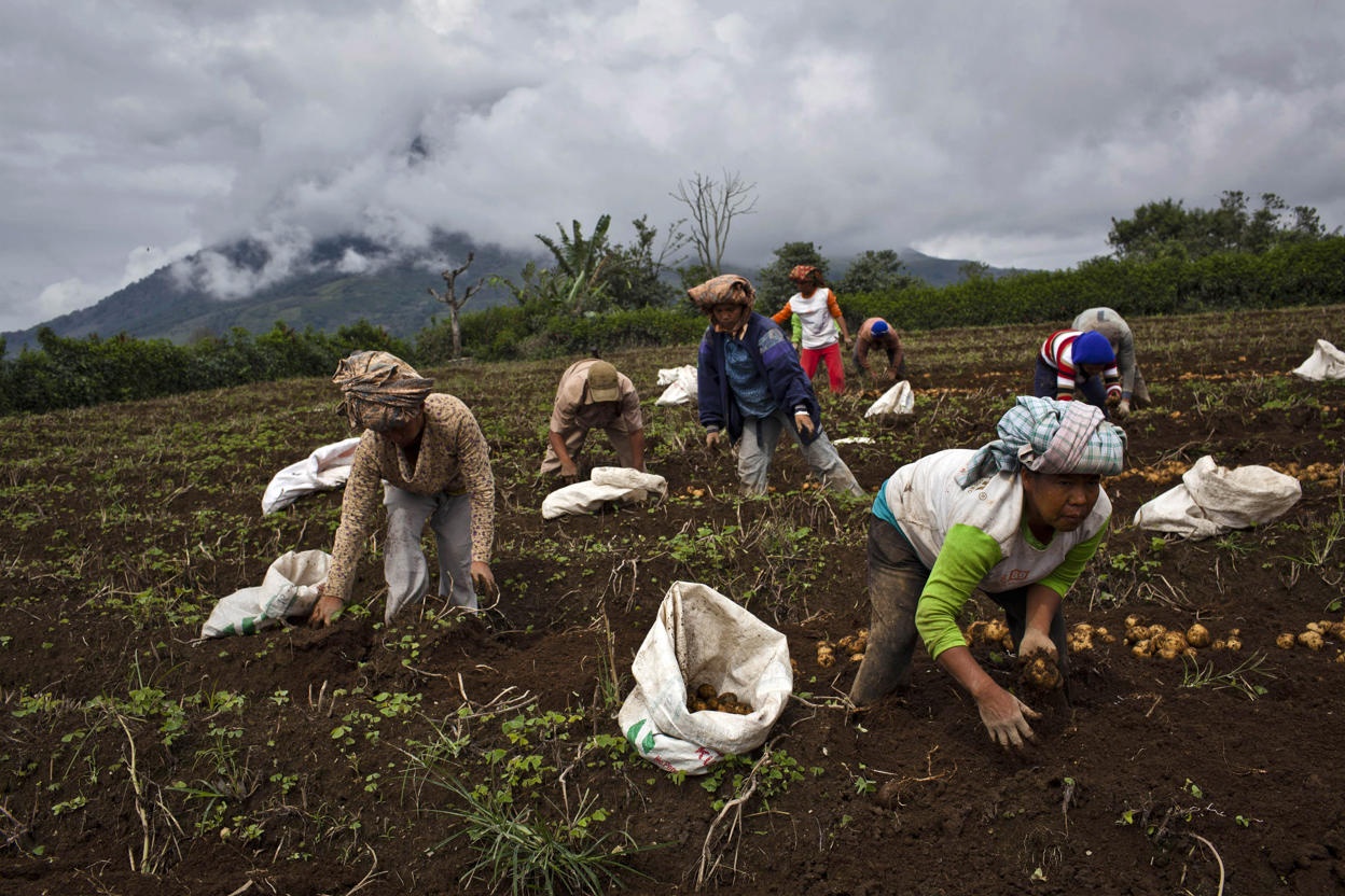 Dân làng tại huyện Karo, tỉnh Medan tranh thủ thu hoạch khoai tây khi khói, bụi từ núi lửa chưa tới làng của họ. Vị trí này cách núi lửa khoảng 4 km. Ảnh: Getty Image.