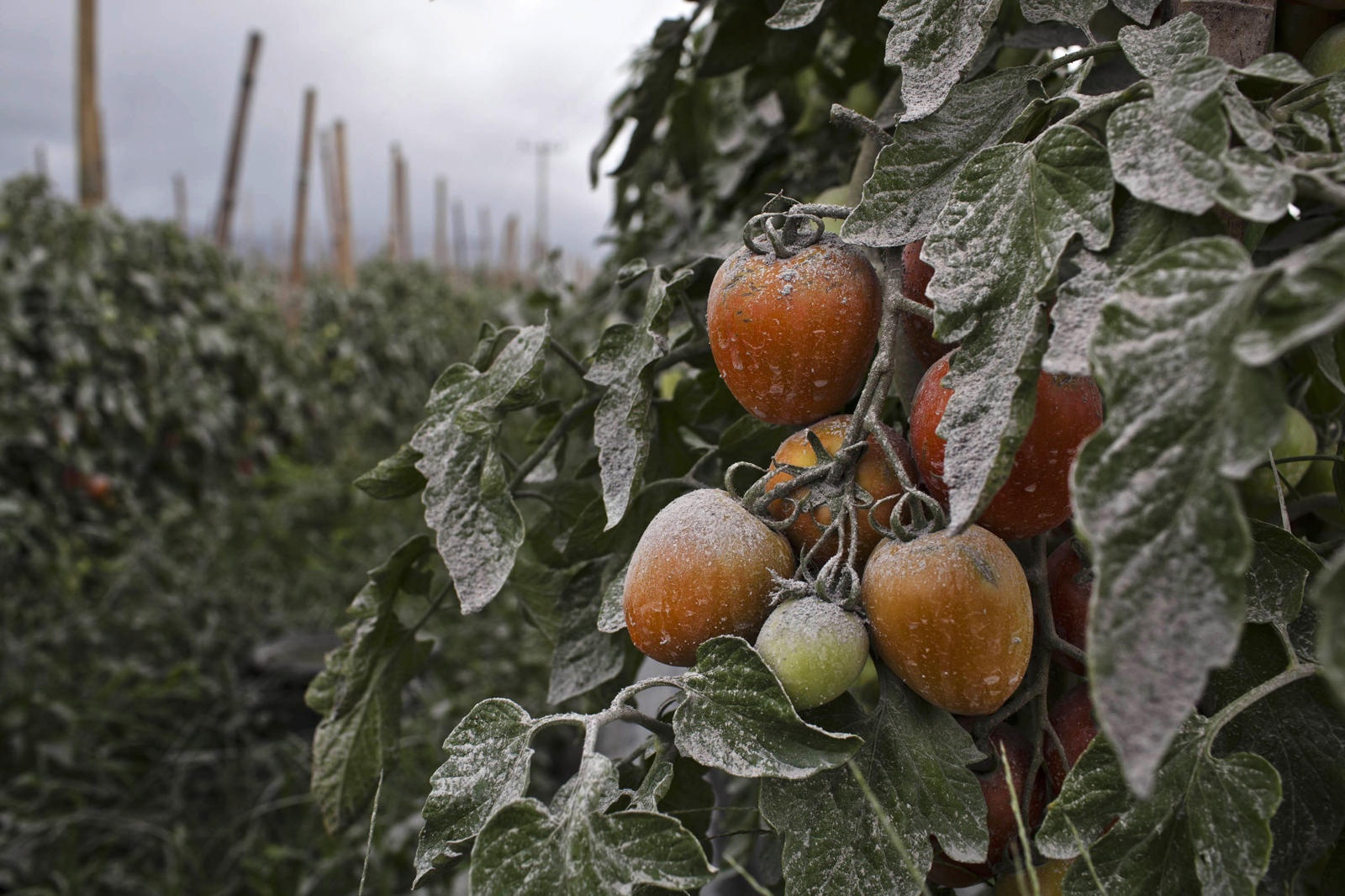 Bụi phủ lên lá và quả cà chua trong một vườn ở huyện Karo, tỉnh Medan. Ảnh: Getty Image.