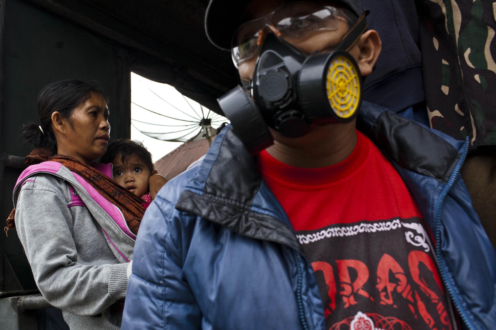 Một thanh niên đeo mặt nạ để chống khói, bụi từ núi lửa khi anh ngồi trên xe tải để rời khỏi làng tại huyện Karo. Ảnh: Getty Image.
