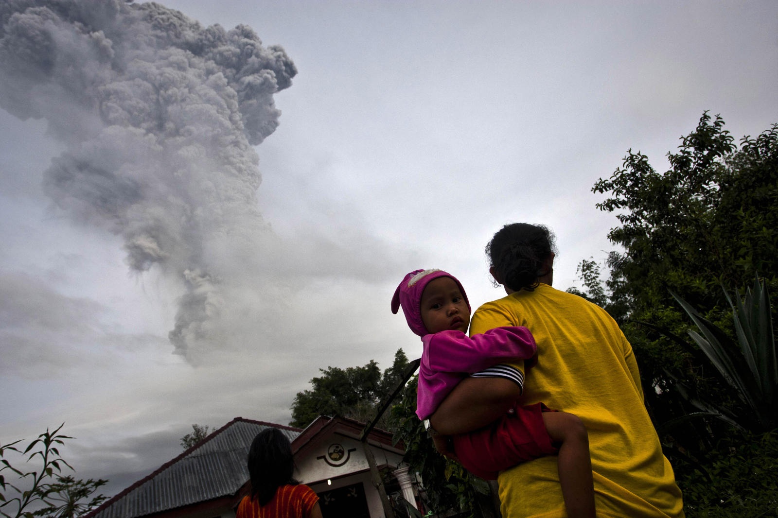 Người phụ nữ tại làng Tigapancur, huyện Karo, bế con và ngắm cột khói, bụi từ núi lửa Sinabung hôm 14/9. Ảnh: Getty Image.