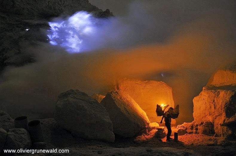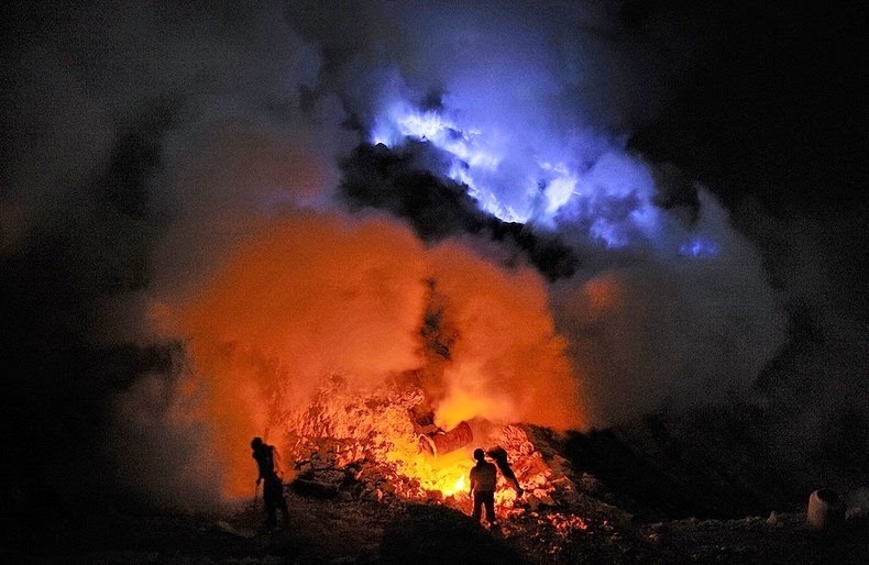 | Vào ban đêm, khí nóng của núi lửa đốt cháy lưu huỳnh và tạo ra những ánh sáng màu xanh kỳ lạ. |