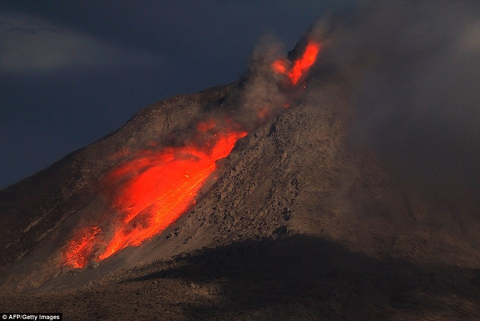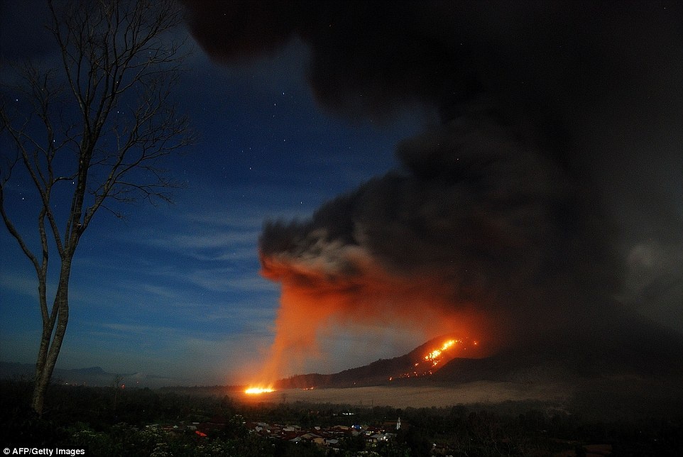 Núi lửa Sinabung, nằm ở phía bắc đảo Sumatra, tiếp tục phun ra dòng dung nham nóng bỏng và những cột tro bụi khổng lồ trong ngày hoạt động thứ 4 liên tiếp. Ảnh: EPA