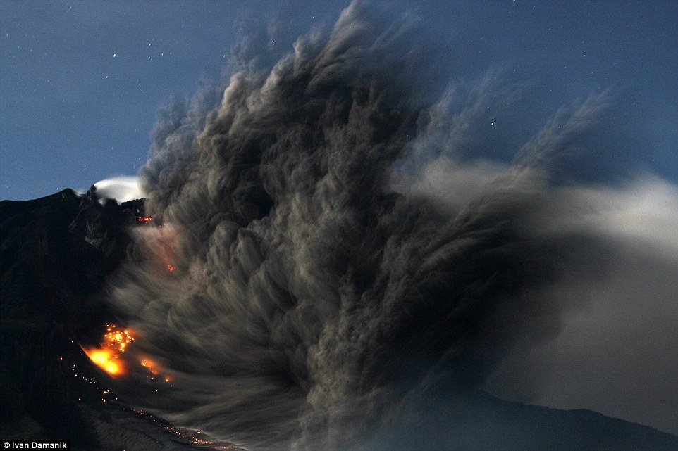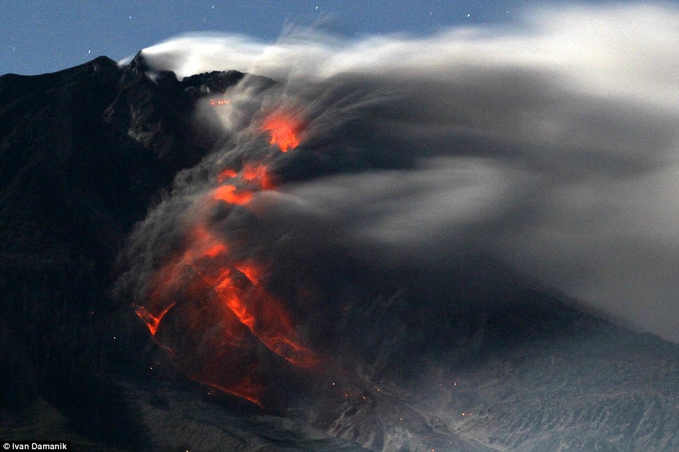 | Cảnh tượng huyền ảo tạo bởi dòng dung nham và khói bụi trên núi Sinabung. Ảnh: Ivan Damanik |