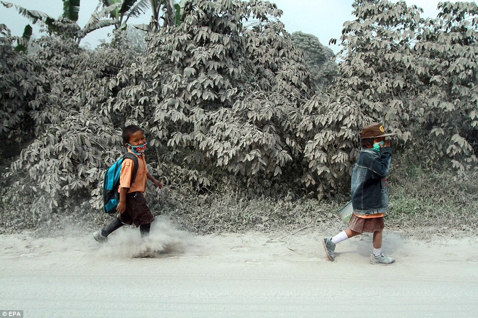 | Hai em bé trên đường đi học khi khung cảnh xung quanh nhuốm tro bụi. Ảnh: EPA |