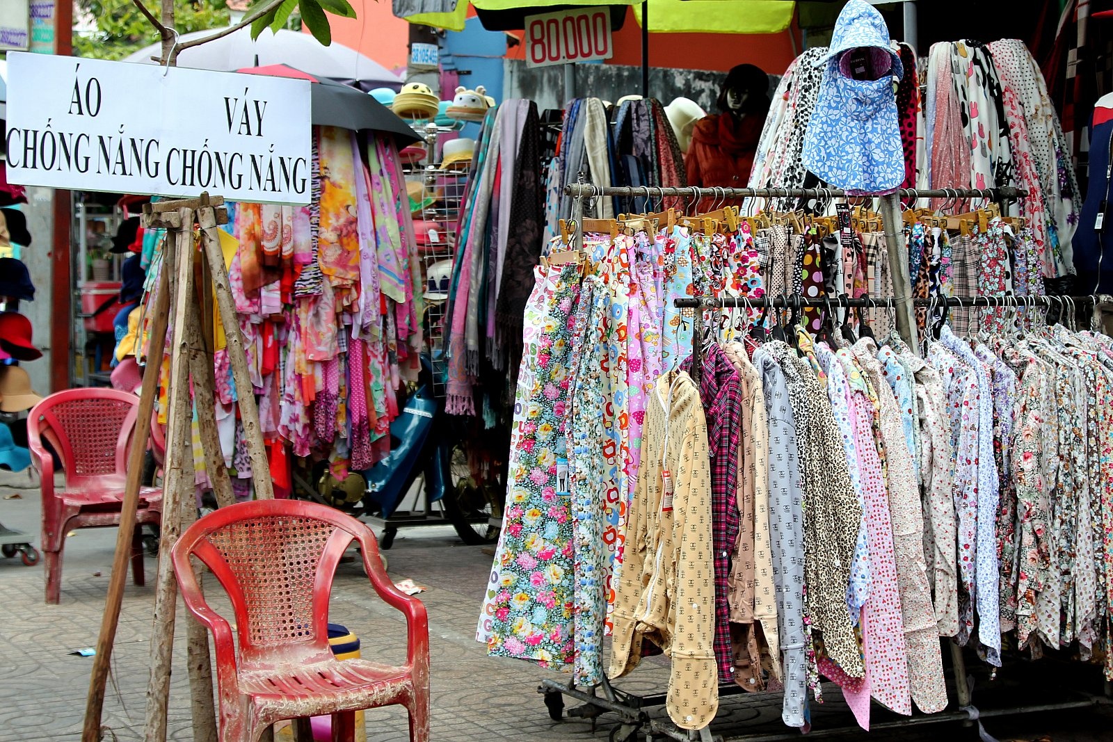 Một gian hàng bán áo, váy chống nắng trên đường Nguyễn Trãi quận 5. Ở đây mỗi chiếc áo chống nắng có giá từ 90.000 - 200.000 đồng, váy chống nắng 150.000/chiếc, thu hút rất đông khách ghé mua.