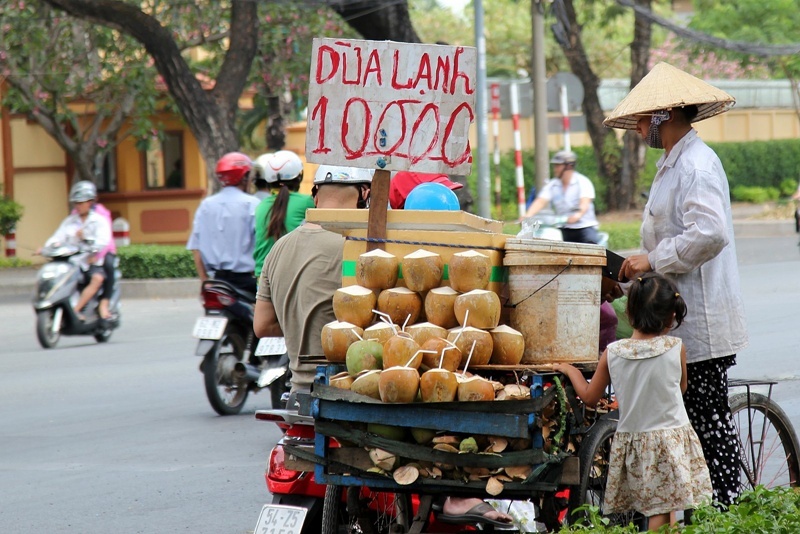 | Dừa tươi là món giải khát được ưa chuộng những ngày nắng nóng. Quả ướp lạnh có giá 10.000 đồng được bày bán dọc khắp các tuyến đường ở TP.HCM. Chị Tâm, bán dừa trên đường Nguyễn Văn Cừ, quận 5, cho biết do trời nắng nóng nên có ngày chị bán đến 200 trái. |