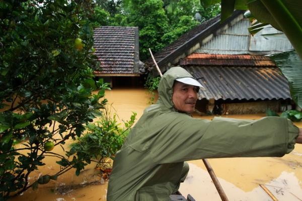 | Ông Hoàng Văn Hoàn - bí thư xã Phương Điền đi khảo sát tình hình ngập lũ. |