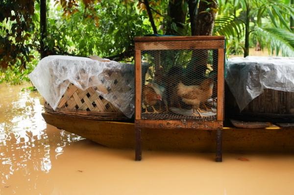 | Một chuồng gà của người dân được di chuyển lên thuyền. |