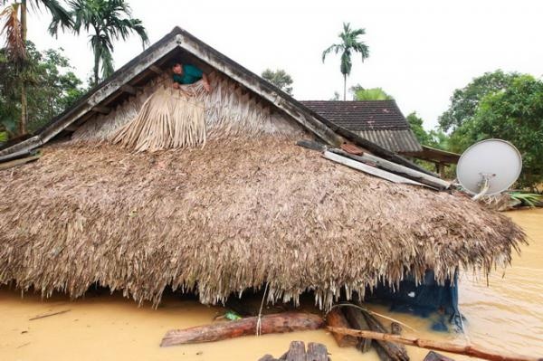 Bà Đặng Thị Hương, 60 tuổi, ở xóm 3, xã Phương Điền, bám lấy hè nhà nói lớn: "Lũ lớn lắm, từ hôm qua hai vợ chồng già tui chỉ biết ngồi trên trần nhà tránh lũ. Bao nhiều tài sản trong nhà gần trôi hết".