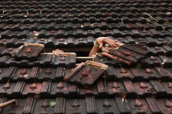 | Do mực nước dâng cao, một người dân phải dỡ bỏ một số tấm ngói để vượt ra ngoài. |
