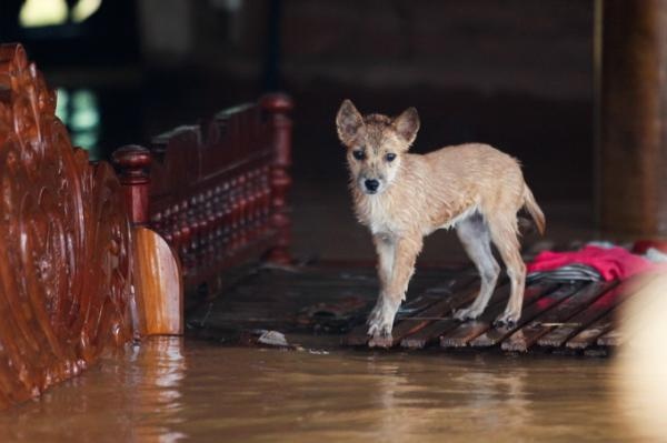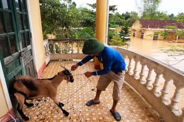| Một chú dê được người dân di chuyển lên tầng 2 của trường tiểu học Phương Mỹ tránh lũ. |
