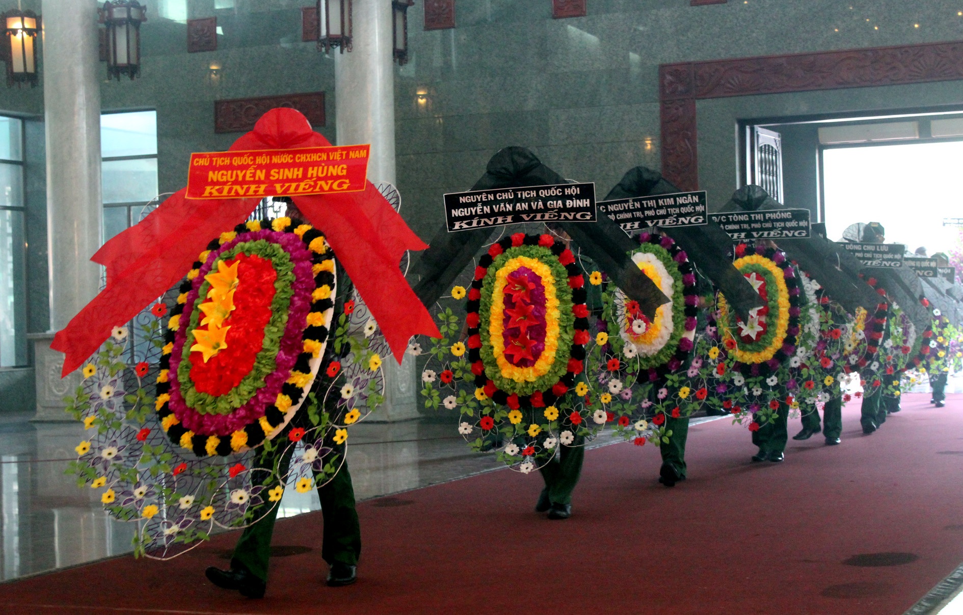 | Tổng bí thư Nguyễn Phú Trọng, Chủ tịch nước Trương Tấn Sang, Chủ tịch Quốc hội Nguyễn Sinh Hùng cùng nhiều lãnh đạo Đảng, Nhà nước gửi lẵng hoa đến viếng. |