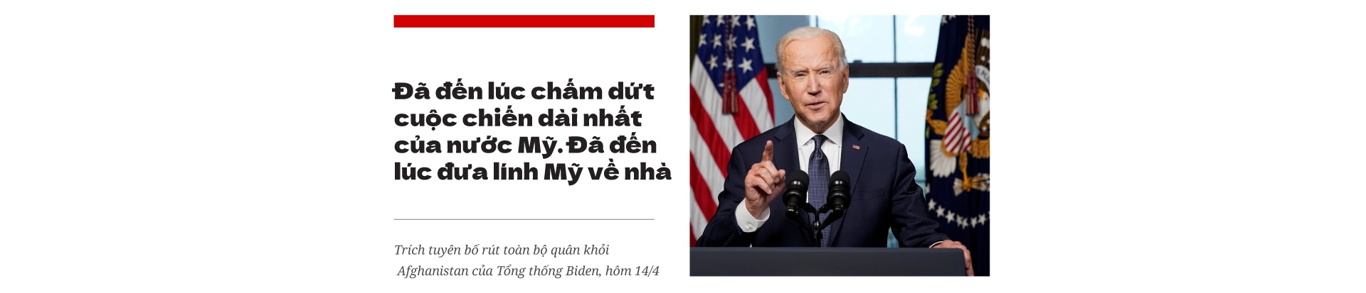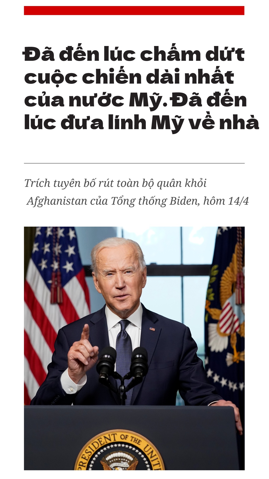 "Đã đến lúc chấm dứt cuộc chiến dài nhất của nước Mỹ. Đã đến lúc đưa lính Mỹ về nhà", ông Biden tuyên bố hôm 14/4, về quyết định dấu ấn trong 100 ngày đầu: Rút toàn bộ lính Mỹ khỏi Afghanistan trước ngày 11/9.