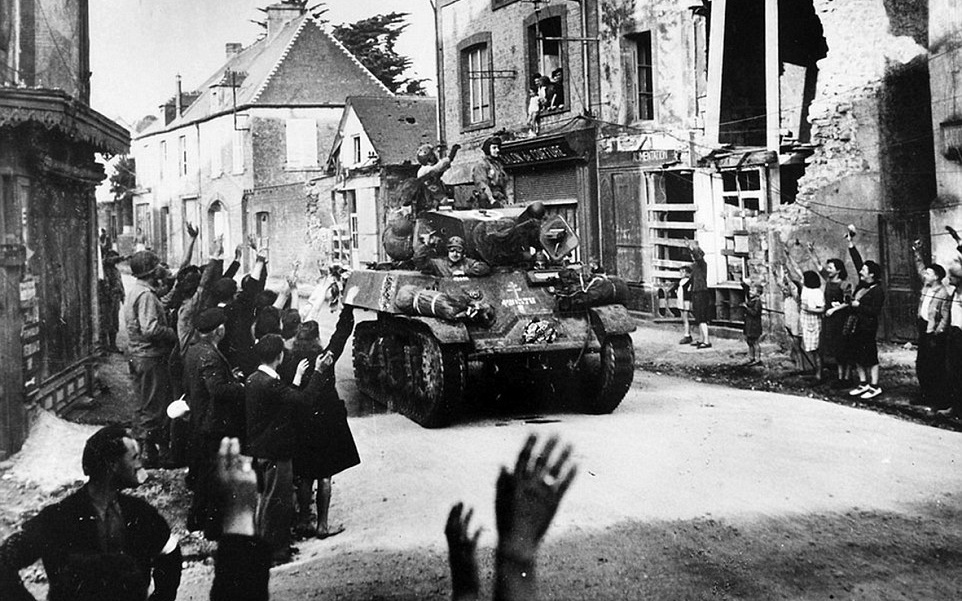 | Người dân chào đón nồng nhiệt một xe tăng của quân đội Pháp khi nó di chuyển qua thị trấn Sainte Mere Eglise. Ngôi nhà bị đánh bom năm xưa nay là một cửa hiệu quần áo. |
