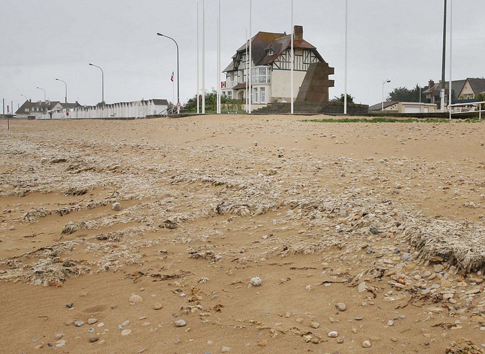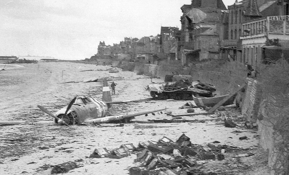 | Xác máy bay của quân đội Mỹ nằm ngổn ngang ở Saint-Aubin-sur-Mer, gần bãi biển Juno, tây bắc nước Pháp, sau khi bị bắn rơi. Ngày nay, cờ của các nước tham gia cuộc đổ bộ lịch sử tung bay dọc bãi biển, giữa khung cảnh thanh bình. |