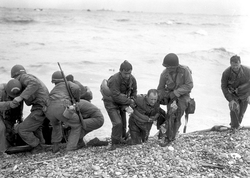 | Binh sĩ Mỹ đưa đồng đội lên bờ sau khi tàu của họ bị quân Đức Quốc xã đánh chìm tại bãi biển Omaha. Ngày nay, nơi đây là một trong những điểm tắm nắng lý tưởng tại Pháp. |