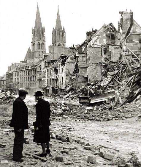 | Người dân Pháp đứng nhìn một chiếc xe ủi đất của Canada di chuyển qua thành phố Bayeux sau một trận đánh bom của quân Đồng minh. Phần lớn thành phố đã được tái thiết sau thời chiến. |