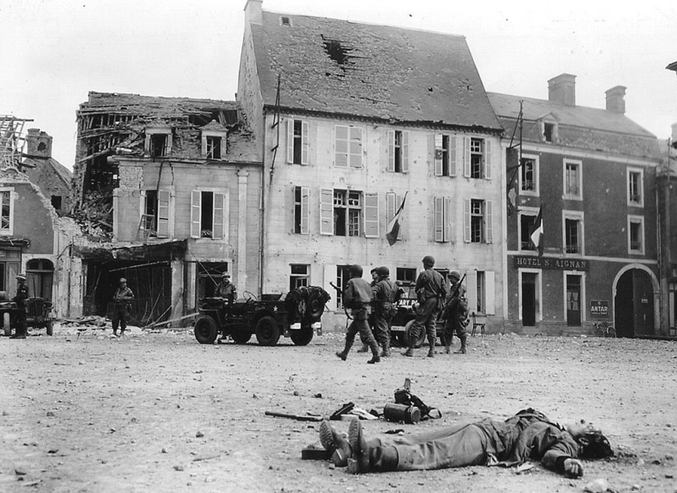 | Thi thể binh sĩ của quân đội Đức nằm tại khu vực quảng trường Trevieres, gần bãi biển Omaha. Ngày nay, nơi đây là một khu dân cư đông đúc. |
