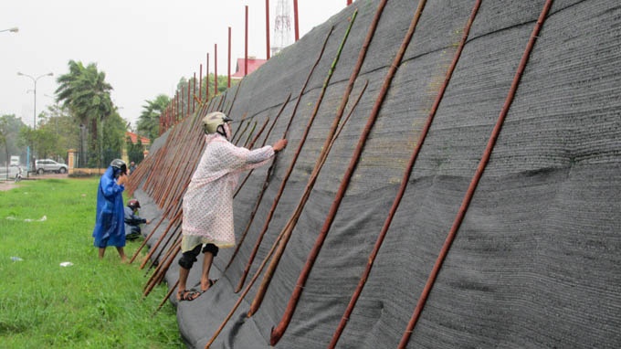 | Công nhân Trung tâm Công viên cây xanh Đồng Hới che chắn công trình ngoài trời phòng chống bão sáng 30/9. Dù mưa to gió lớn và dự báo là vùng gần tâm bão nhưng xe cộ trên quốc lộ 1A qua huyện Lệ Thủy vẫn đi lại khá nhiều. |