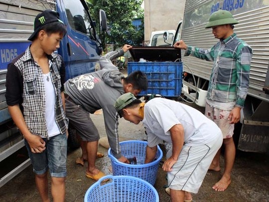 | Thương lái tìm đến tận các nhà bè để thu mua cá lăng. |
