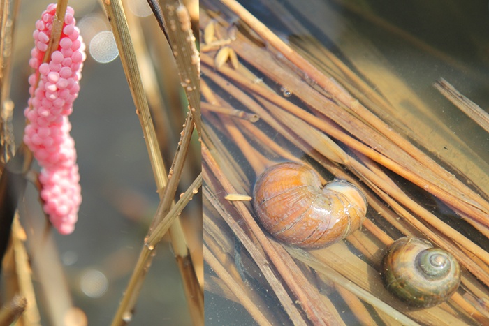 | Nguồn thức ăn chính của vịt trên các cánh đồng này là lúa còn sót lại, ốc bươu vàng, trứng ốc.... |