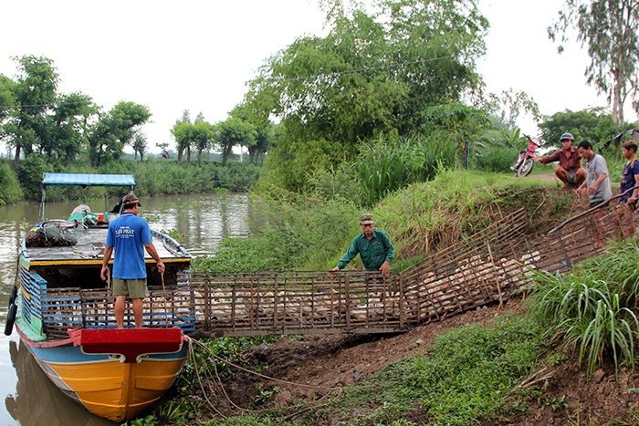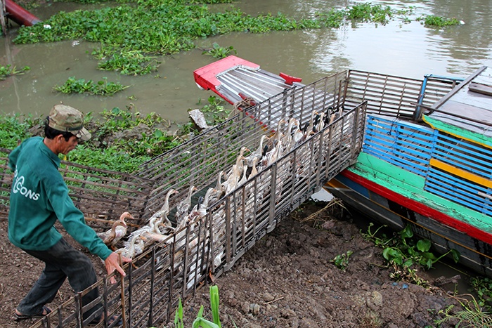 | Đàn vịt đẻ của ông Đức, 55 tuổi (xã Bình Thạnh Đông, Châu Phú, An Giang) đang được đưa lên thuyền để vận chuyển sang đồng mới ở Kiên Giang. Đây là chiếc thuyền được thiết kế riêng và chỉ sử dụng cho việc vận chuyển gia cầm trên sông. |