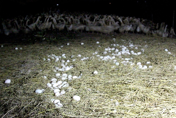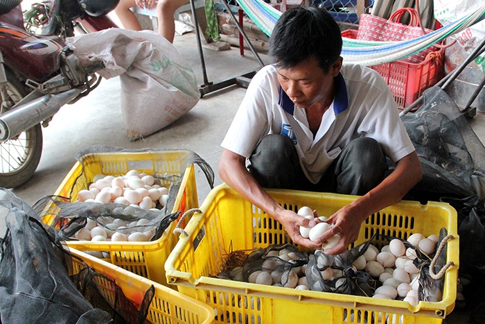 | Ông Đức, người có kinh nghiệm hơn 30 năm nuôi vịt đẻ chạy đồng, cho biết: "Người nuôi thương thu hoạch trứng từ 3h sáng, vào thời điểm này đa số vịt đã "rớt hột", nên phải nhặt ngay để bảo vệ an toàn cho số trứng". |