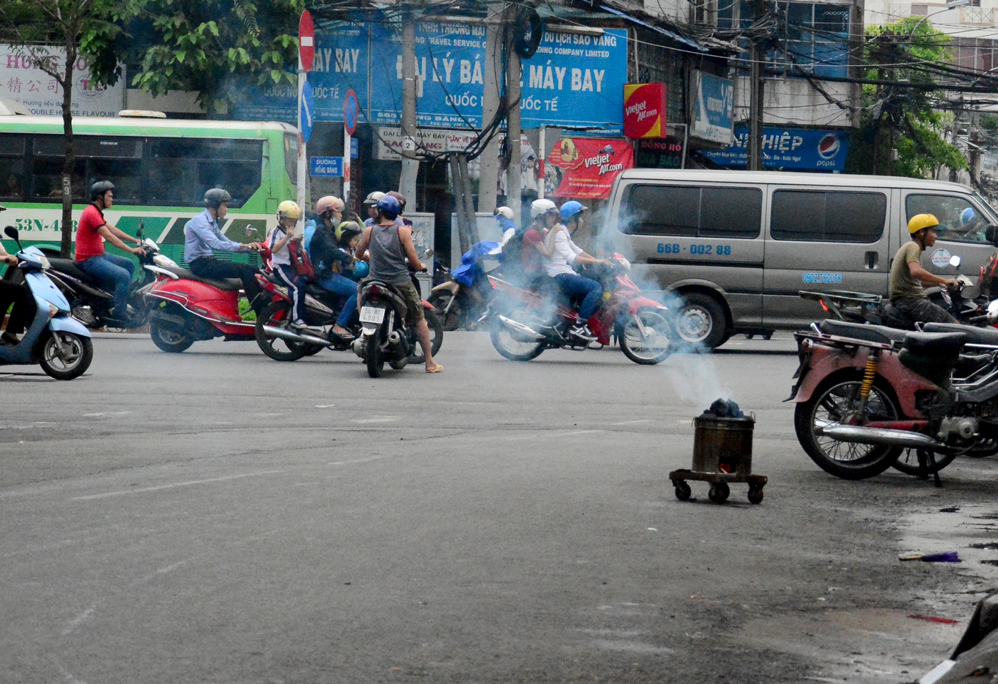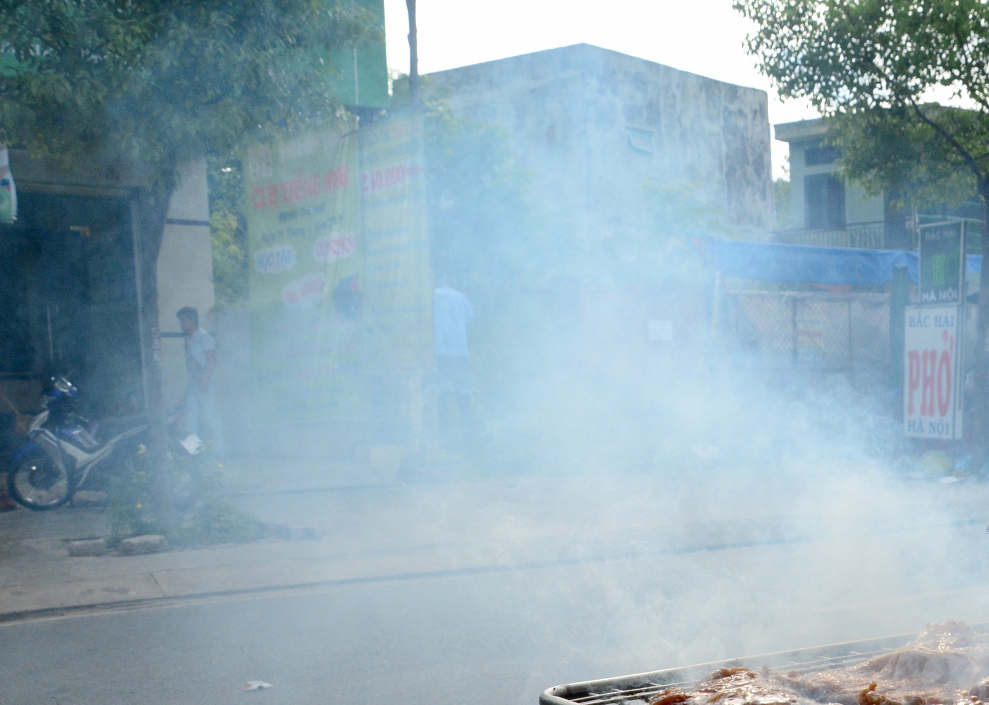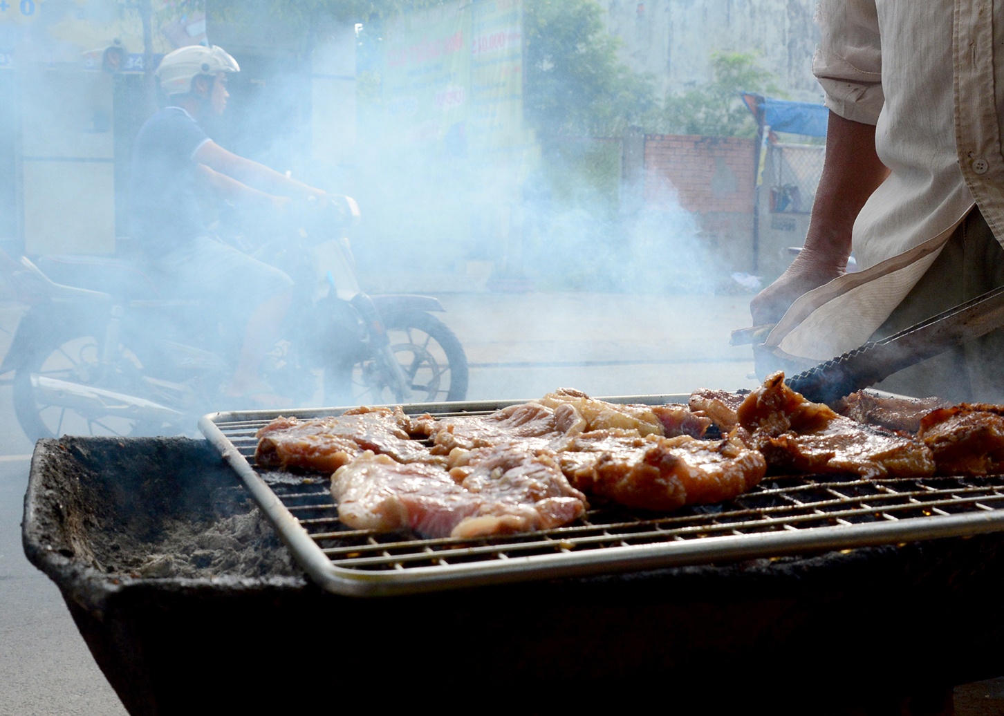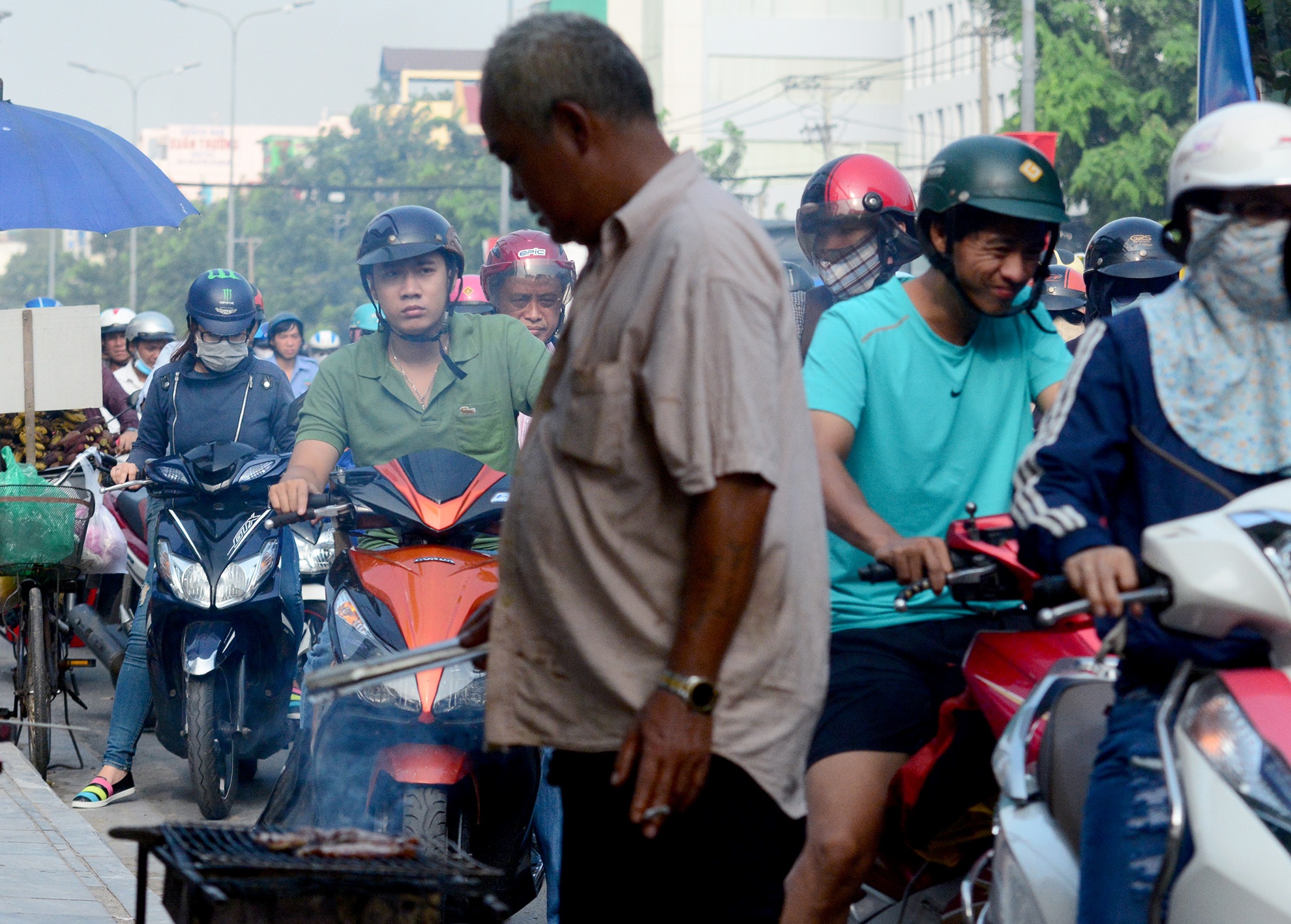 Người đi đường vừa chịu cảnh kẹt xe vừa phải nhăn nhó, nín thở khi một bếp nướng đặt ngay mép đường Cộng Hoà (quận Tân Bình) tỏa khói, sặc mùi mỡ thịt, gia vị cháy xèo trộn lẫn với than bay thẳng vào mặt.