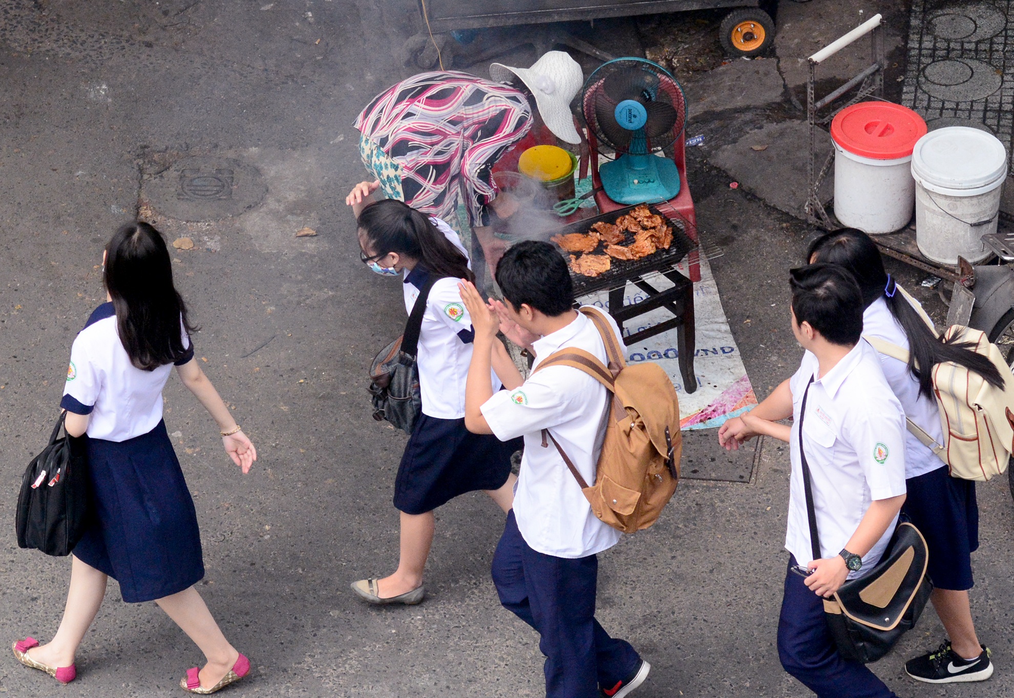 | Học sinh qua lại quán thịt nướng này phải đi vội, quay mặt sang một bên, lấy tay che tránh khói bay vào mặt, mùi thịt nướng bám vào quần áo. |