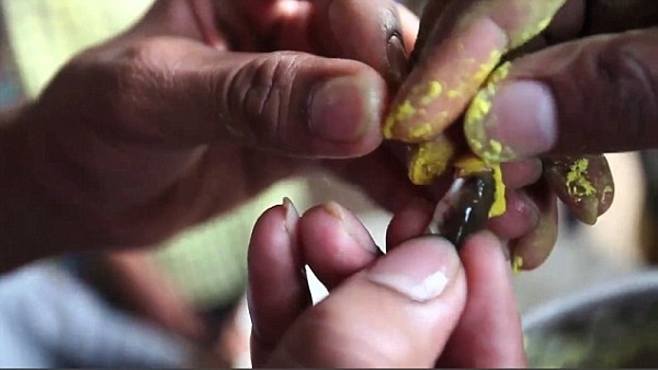 | Bệnh nhân hen suyễn sẽ phải nuốt một con cá sống dài khoảng 5 cm có bôi một thảo dược gia truyền màu vàng vào cổ họng. Ảnh: Dailymail. |