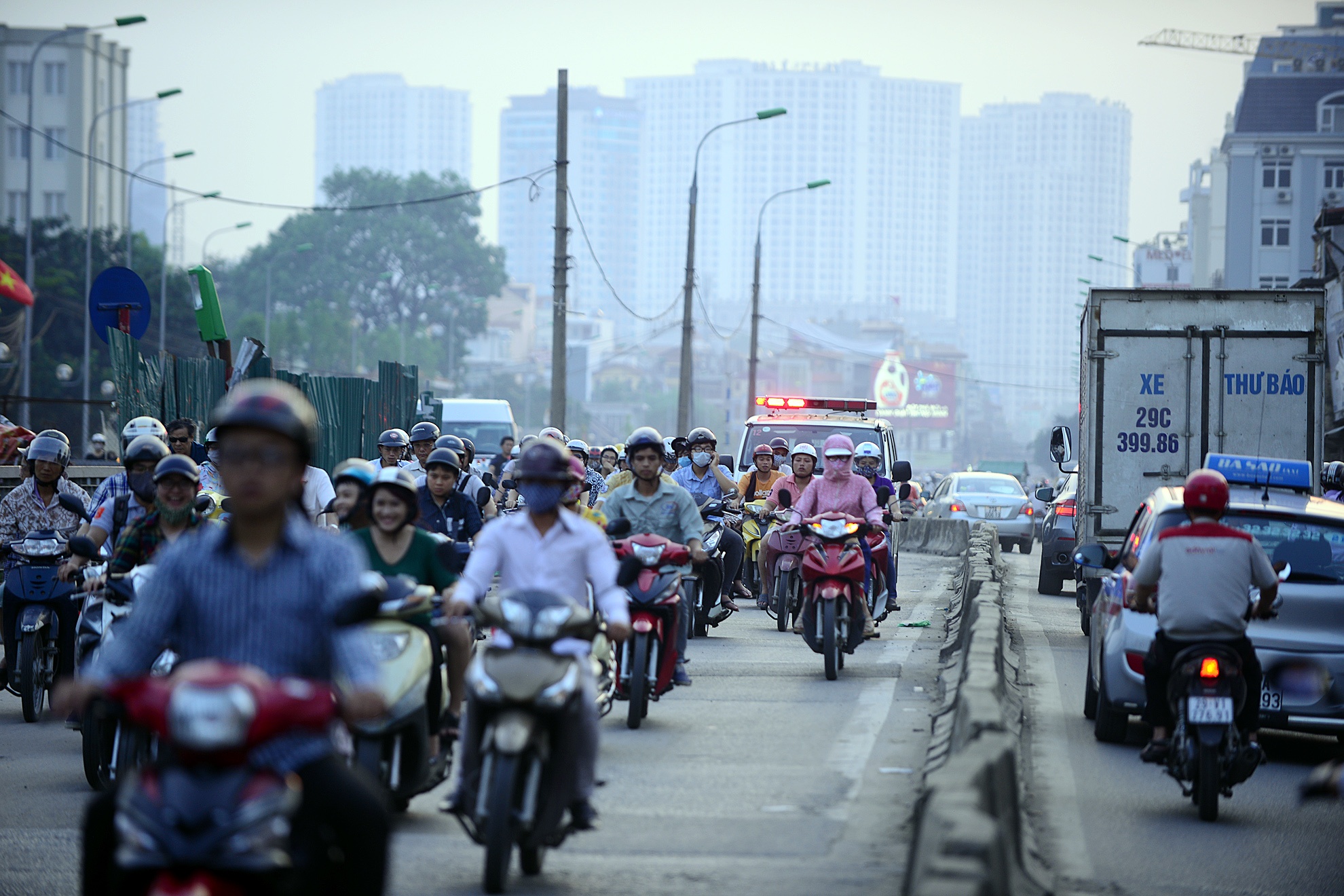 Công trường đang thi công quây tôn lấn một phần diện tích mặt đường nên luồng lưu thông từ cầu Sông Lừ đến Ngã Tư Vọng vốn đã hẹp, lại càng hẹp hơn.