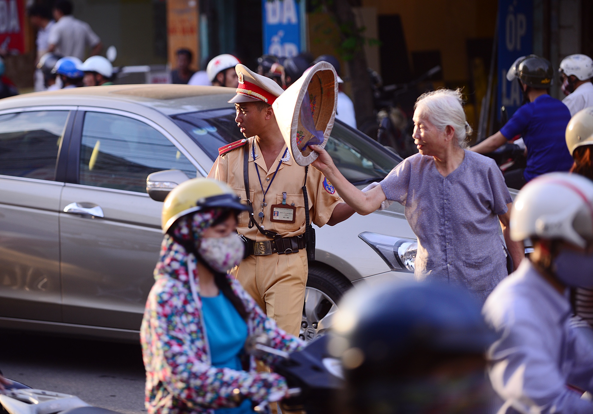 Nhiều người đi bộ sang đường phải nhờ sự giúp đỡ của lực lượng cảnh sát giao thông.