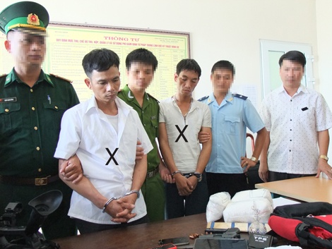 | Cường và Dũng (X) bị công an bắt quả tang cùng tang vật. |