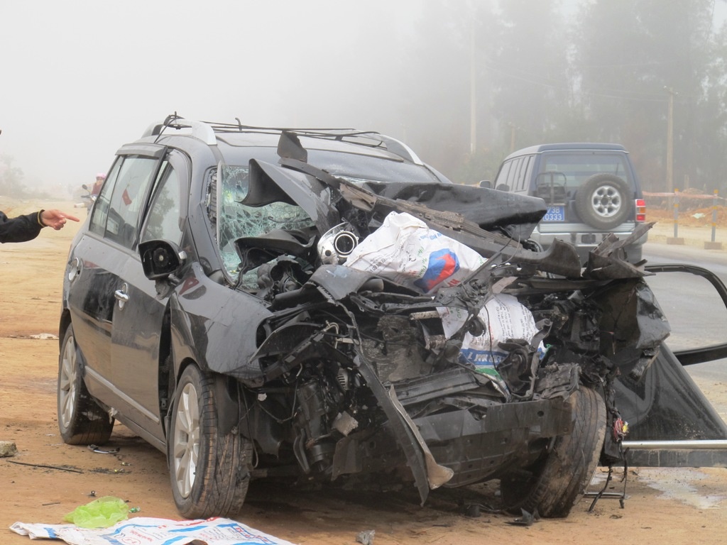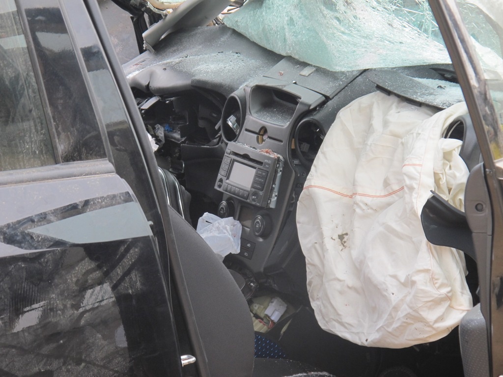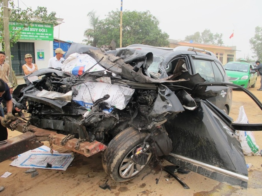 | Trong xe ô tô có 7 người trong một gia đình. Sau cú va chạm rất mạnh, ô tô bị dập nát và biến dạng hoàn toàn phần đầu. |