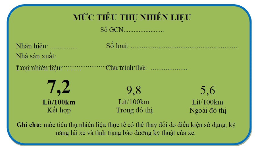 Trong khi đó, tem màu vàng cũng thể hiện các số liệu tiêu thụ nhiên liệu của xe, nhưng do doanh nghiệp tự công bố. Cục Đăng kiểm chỉ kiểm tra mức độ hợp lệ của hồ sơ được nộp và phương pháp thử nghiệm được sử dụng. 8 doanh nghiệp hiện nộp hồ sơ dán loại tem này gồm Toyota, Honda, Suzuki, Ford, Nissan, Audi, BMW và Kia.