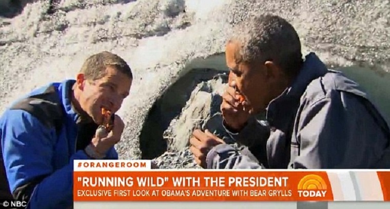Tuần trước, Tổng thống Barack Obama tham gia một tập phim của chương trình thực tế Running Wild with Bear Grylls trong chuyến đi tới Alaska. Ông có bữa trưa đặc biệt do nhà thám hiểm người Anh Bear Grylls chuẩn bị từ những miếng cá hồi gấu ăn thừa. Ảnh: NBC